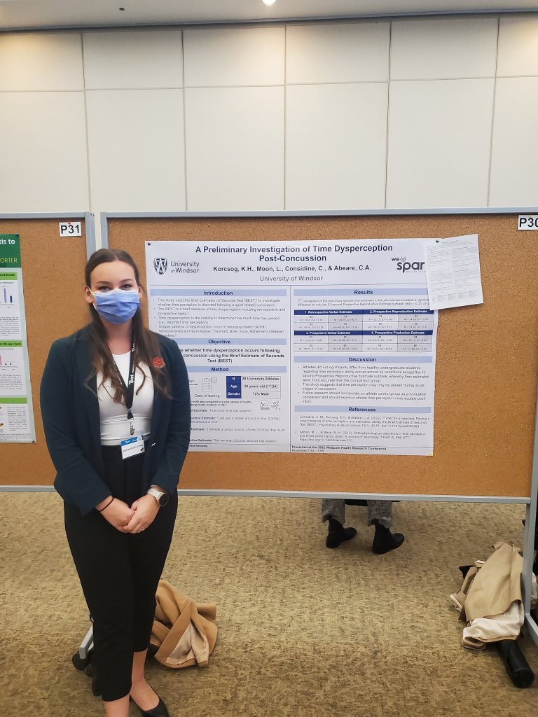 Lab members Kassandra Korcsog and Lauren Moon presented preliminary research on time dysperception at the WE-Spark Health Research Conference (Windsor ON, November 2022).