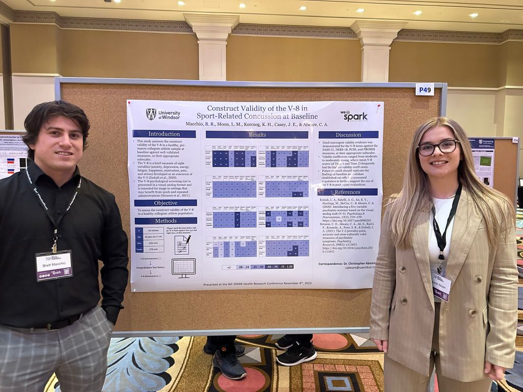 Thesis students Lauren Moon (right) and Brett Macchio (left) presented research at the WeSpark Health Conference (Windsor ON, November 2023)